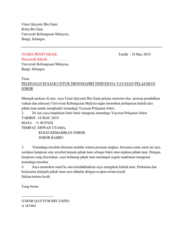 Contoh Surat Tidak Hadir Ke Sekolah Kerana Cuti Sakit Alasan Yang Munasabah Contoh Surat Rasmi Tidak Hadir Bimbang Penularan COVID-19 Contoh Surat Rasmi 1 Cuti Sakit Contoh 2 Masalah Keluarga Contoh 3 Balik Kampung Kematian Saudara Terdekat Contoh 4 Hal Keluarga Format Surat Nota Peringatan. Surat Permohonan Pindah Kuliah. Beginilah Contoh surat permohonan kerjasama bantuan dana izin tempat cerai beasiswa maaf dispensasi ganti nama Dll.